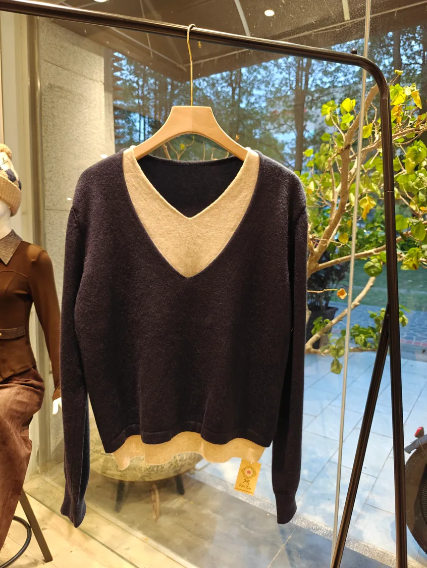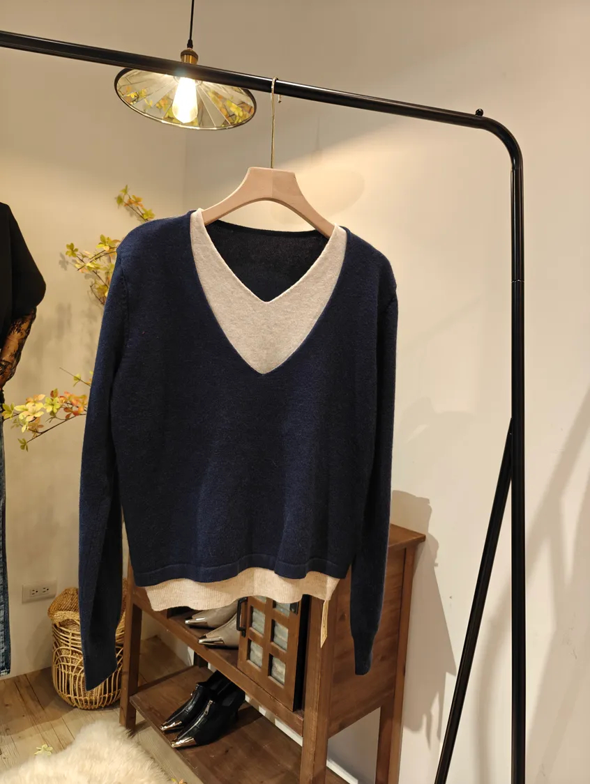 設計師親膚軟混羊毛假V雙層拼接針織衫
