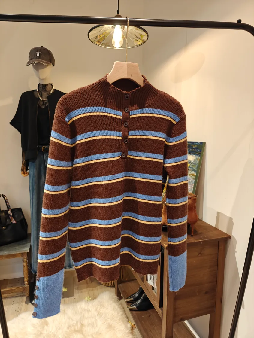韓國厚磅棉微領開釦條紋針織衣