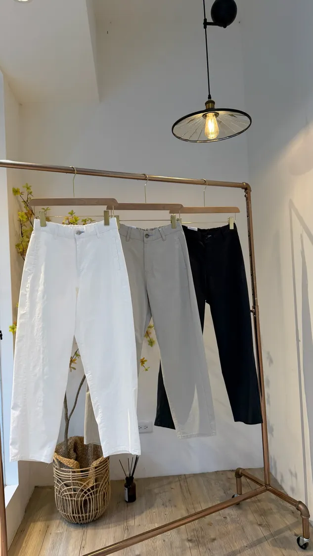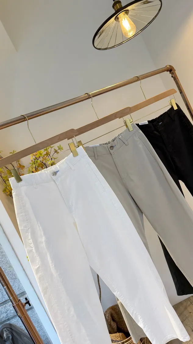 設計師鬆高歐膩純挺薄棉彩色釦眼瘦腿褲